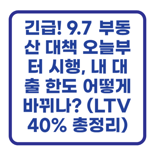어제 저녁 뉴스 보셨나요? 내 집 마련이나 이사를 계획하며 대출을 알아보던 중이었는데, '오늘부터 LTV 40% 강화', '전세대출 한도 축소' 같은 소식이 쏟아져서 깜짝 놀라신 분들 많으실 거예요. 저도 사실 '이거 내 얘기인데?' 싶어서 밤새 관련 내용을 찾아봤답니다. 갑작스러운 정책 발표로 자금 계획에 차질이 생길까 봐 걱정이 많으실 텐데요. 오늘부터 시행되는 9.7 부동산 대책, 그중에서도 가장 중요한 대출 규제 변화에 대해 쉽고 정확하게 알려드릴게요! 😊